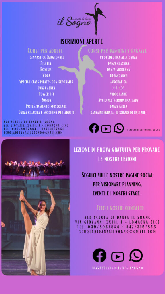 ASD Scuola di Danza Il Sogno - Sede Legale in Via Primo Maggio n°6, 20863, Concorezzo (MB) e Sede operativa in Via Giovanni XXIII n° 1, 23871, Lomagna (LC) - Tel. 039/8967884 - Cell. 347/315856 - Email  scuoladidanzailsogno@gmail.com